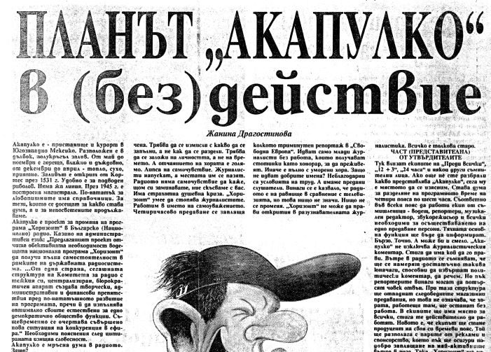 През втората половина на 1990-а Йордан Лозанов, моторът на промените в „Хоризонт“, подхвана инициатива за търсене на управленско решение, което да се справи с проблемите в координацията и планирането и да въведе нормални, продуцентски методи на работа в програмата, на които тогава казвахме „екипен принцип“. Идеята беше проста и доказана в управленските модели на медиите на Запад – всеки сегмент на програмата да има своя продуцент, който да отговаря за планирането, осъществяването и бюджетирането на предаването от „А“ до „Я“. Той поръчва и разпределя задачите, той следи за качеството на съдържанието и той определя ресурсите, които отиват за неговата реализация. Над продуцентите на сегменти стои един общ директор на новините, който решава коя тема в какъв формат къде отива и координира планирането между предаванията. Ръководството на „Хоризонт“ изглеждаше склонно да разгледа такова предложение и Йордан започна да събира екип, който да го разработи. Нарече го план „Акапулко“, на името на елитния в онези години мексикански курорт, чиито хотели освен терен за папарашки снимки на холивудски звезди бяха и място за откъсване от всекидневието и стратегическо планиране на много от бордовете на големите американски корпорации.