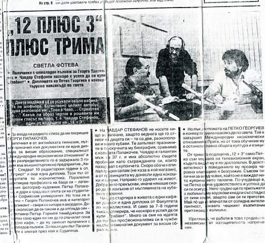 „Двете мадамки са се усукали около кабината на шофьора. Естествено целият автобус чува разговора им: „Това е Чаво, страхотен е…“, с този разказ от софийското всекидневие започва статията на Светла Фотева във вестник „Демокрация“ от 1991 година: