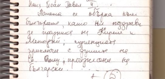 Обикновено диктувахме по телефона репортажите и стенографките ги предаваха на редакторите на съответното предаване. През 1997 като репортер бях в състава на българската делегация, водена от вицепрезидента Тодор Кавалджиев. България традиционно има аудиенция при Папата на този голям български празник. През 97-ма Папа Йоан Павел II за първи път в поздравлението си към нас българите на български, подчерта, че приема Кирил и Методий за покровителите на Европа.